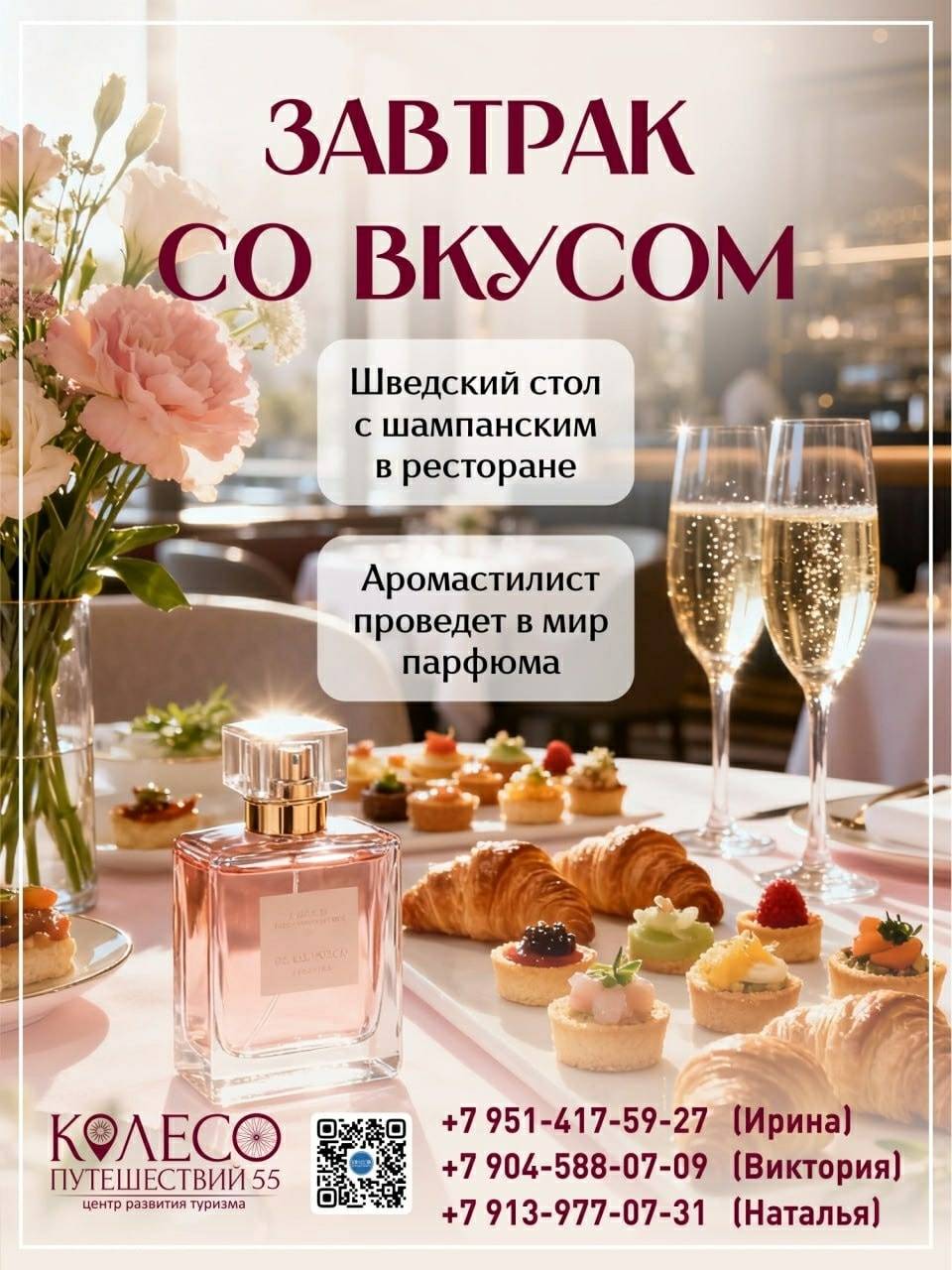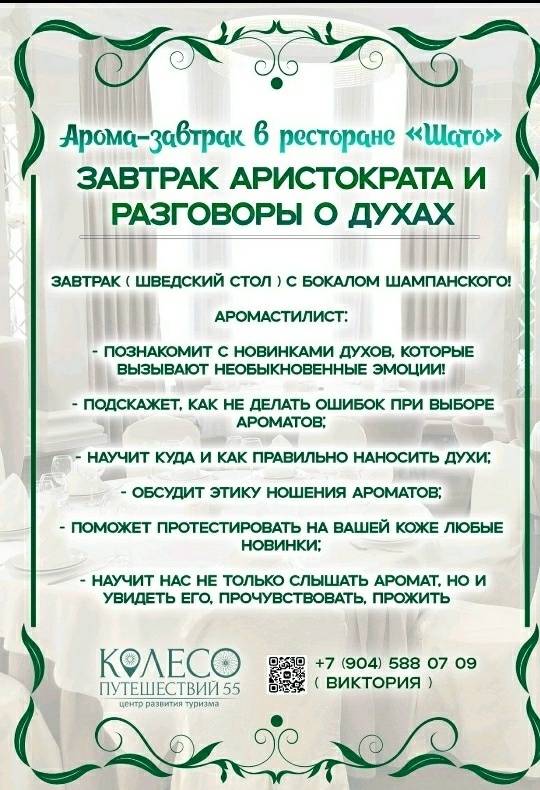 Наталия Белоградова - аромастилист занимающаяся своим любимым делом более 17 лет, проведет нас в мир ароматов, в мир парфюма! И всё это в сопровождении вкуснейшего завтрака ( шведский стол ) с шампанским!