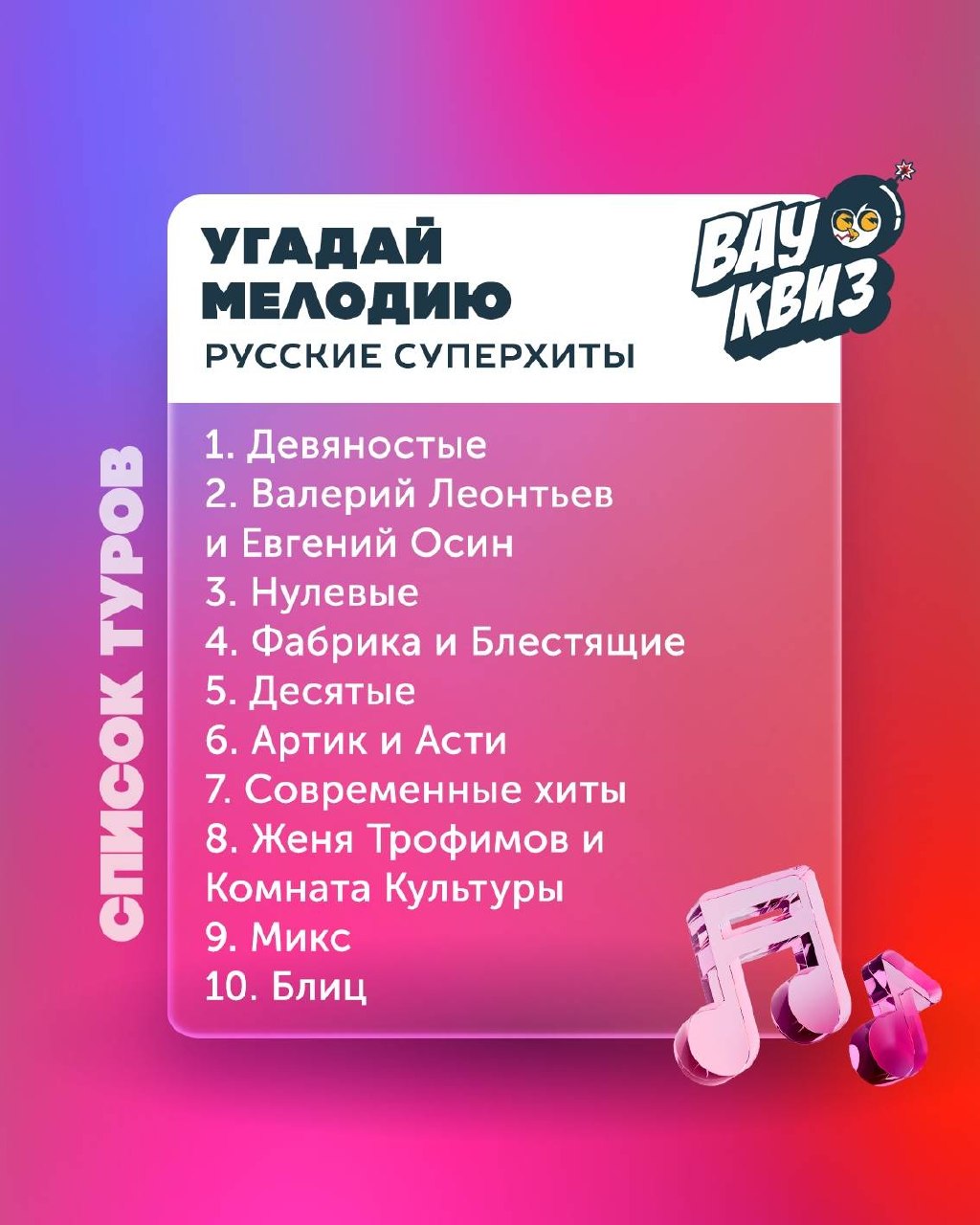 Какая эпоха звучит в вашем сердце громче: задорные 90-е, гламурные 00-е или модные 20-е? 🎵 Мы собрали в одной игре главные русские суперхиты — целых 10 туров чистого музыкального кайфа: Первая точка нашего путешествия — лихие девяностые, где мы отдадим дань легендам — Валерию Леонтьеву и Евгению Осину. Затем нырнем в гламурные нулевые: вспомним, как гремели «Фабрика» и «Блестящие». А потом перенесемся в десятые, где...
