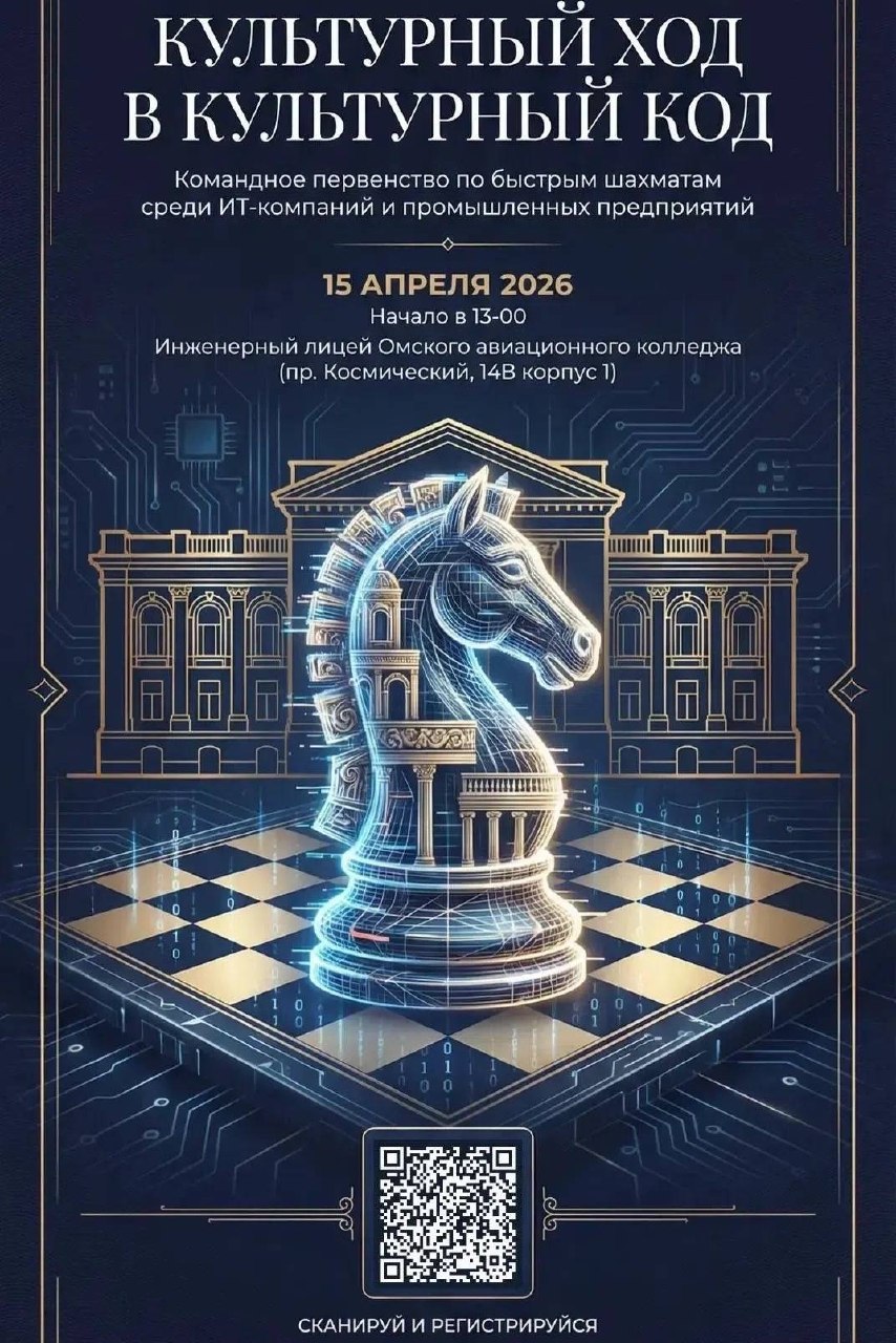 Шахматный турнир «Культурный ход в культурный код» 📅 15 апреля 2026, начало в 13:00 📍 Омск, пр. Космический, 14В корпус 1 (Инженерный лицей Омского авиационного колледжа им. Н.Е. Жуковского) Кто участвует: студенты, школьники, сотрудники ИТ-компаний, промышленных предприятий, органов власти и подведомственных учреждений. Формат: команда из 3 человек (количество команд...