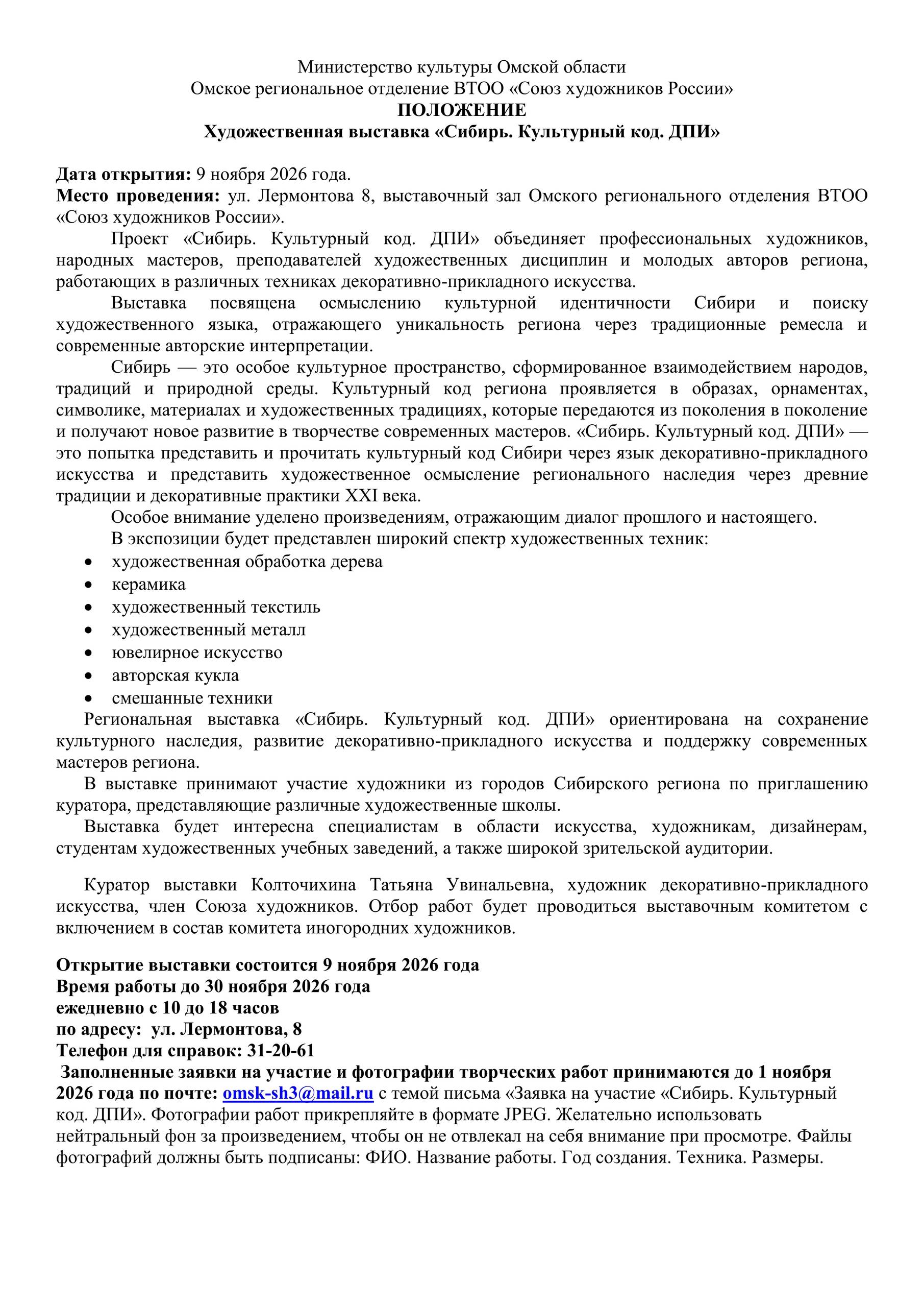 ПОЛОЖЕНИЕ. Художественная выставка «Сибирь. Культурный код. ДПИ»