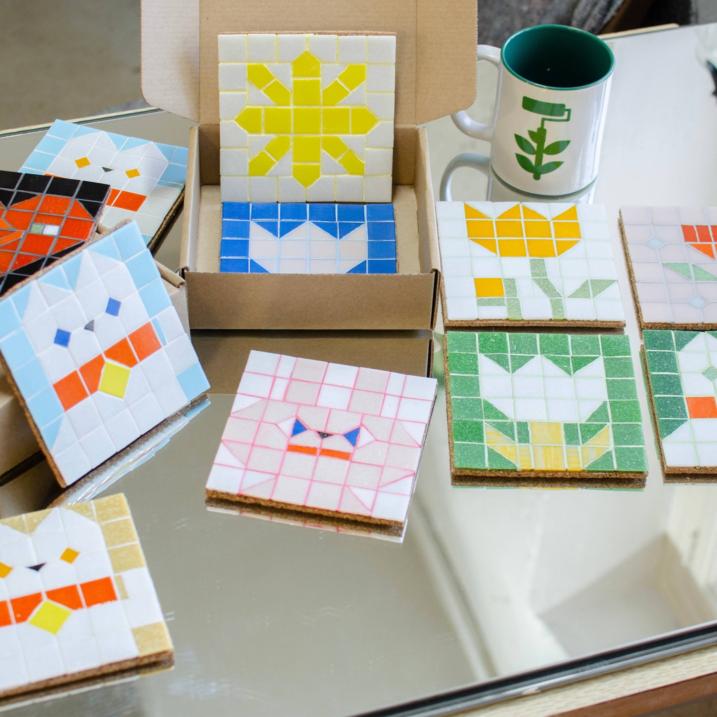 Собираем маленькие пиксельные мозаики из стеклянной плитки. Знакомимся с материалом, работаем кусачками, клеим получившуюся мозаику на пробковую подложку.