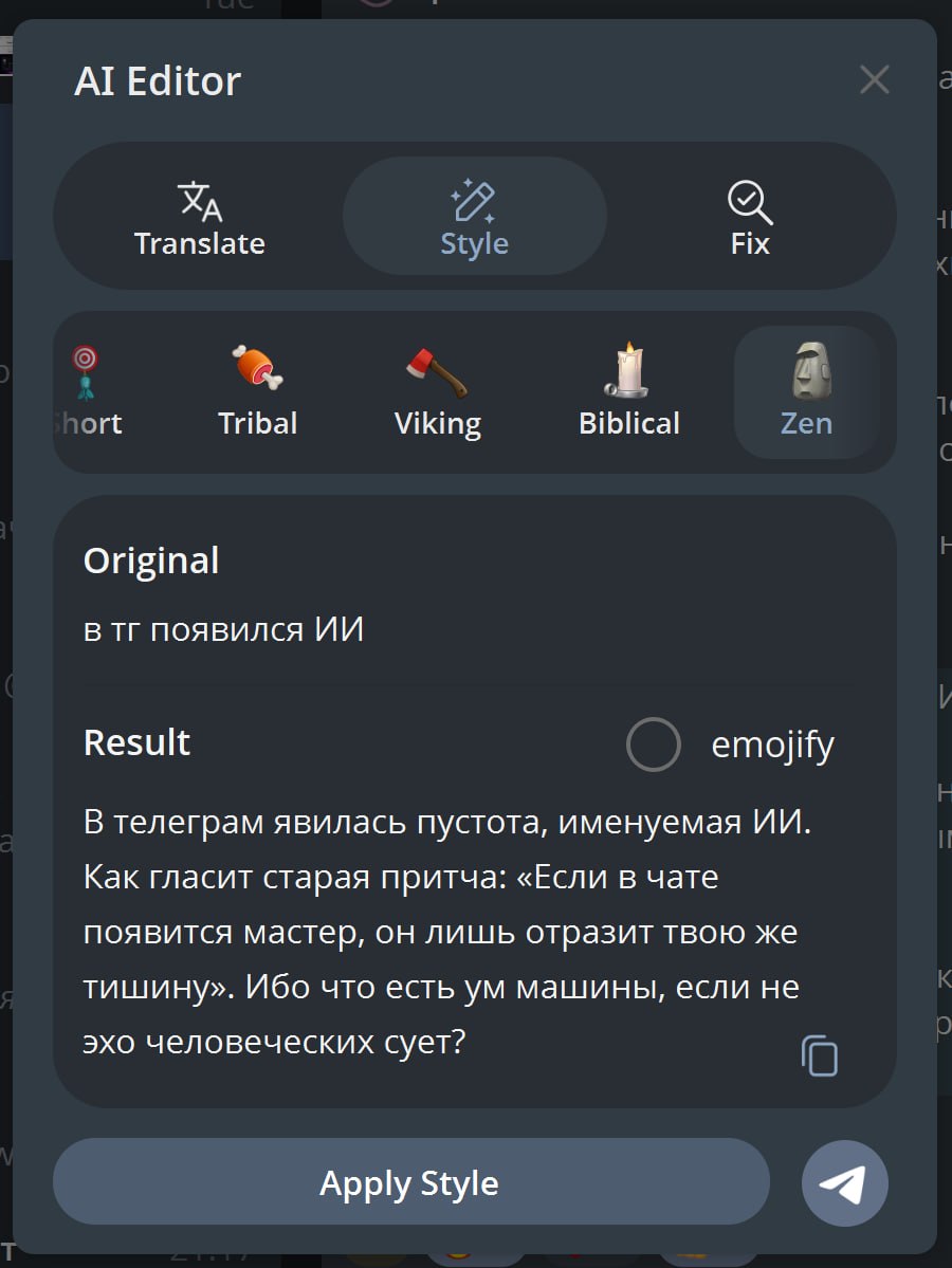 ✈️ В тг появился ИИ редактор. Можно перевести текст, поправить ошибки или изменить стиль.