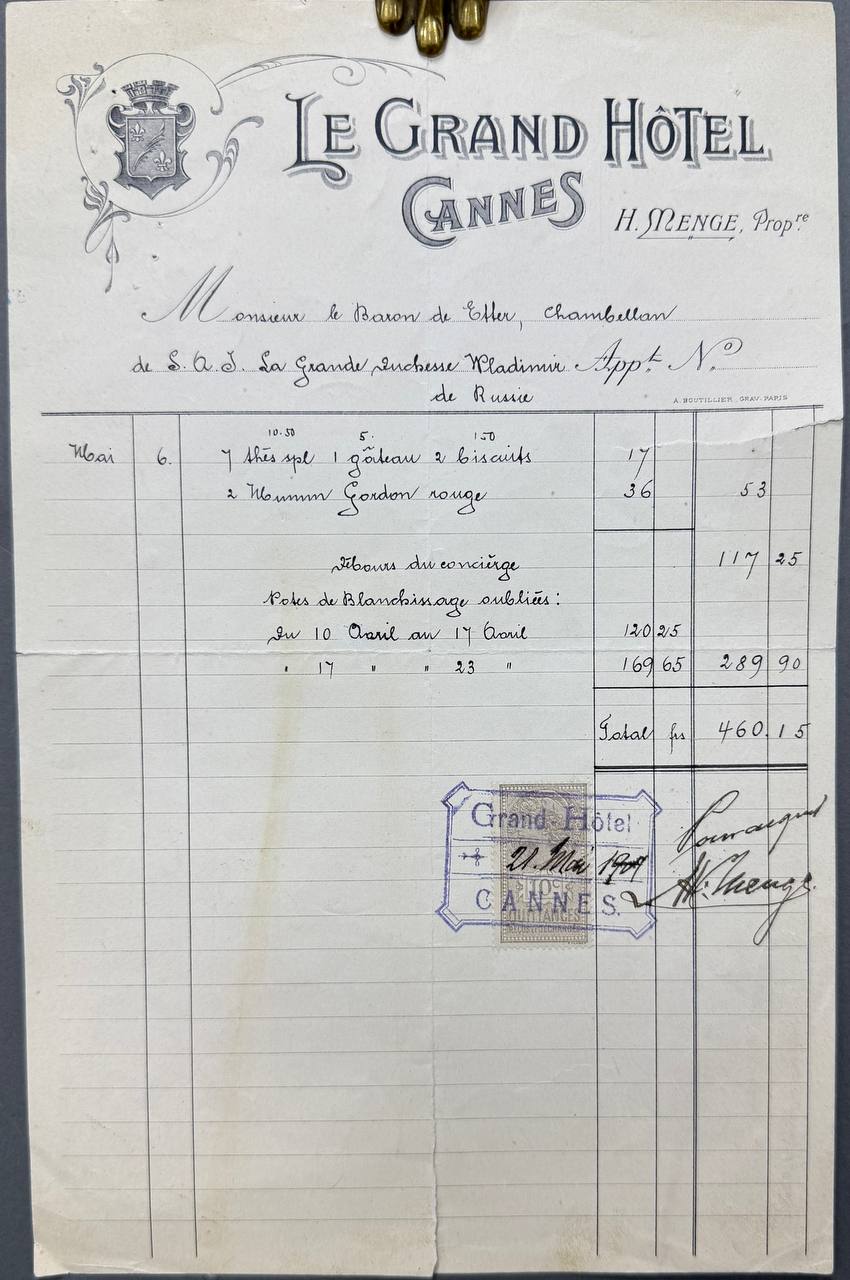 Счёт, выписанный Великой княгине Марии Павловне на лазурном берегу в Le Grand Hotel Cannes. Бисквиты и шампанское Mumm Cordon Rouge. Кордон Руж можно купить и сейчас, цена вопроса 6-7 тысяч рублей.