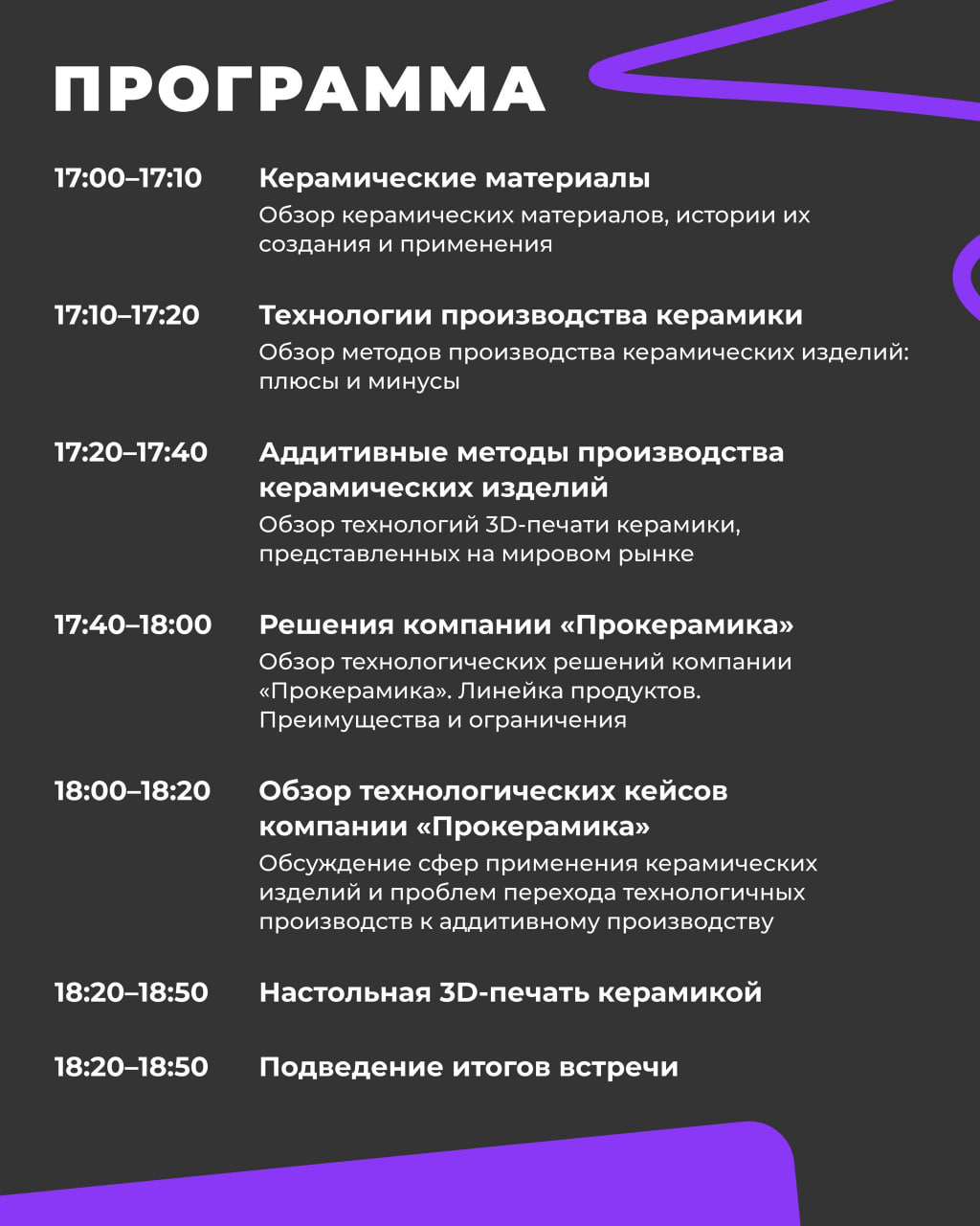 Обсудим технологические решения компании «Прокерамика», сложности перехода к аддитивному производству и на практике продемонстрируем настольную 3D-печать керамикой.