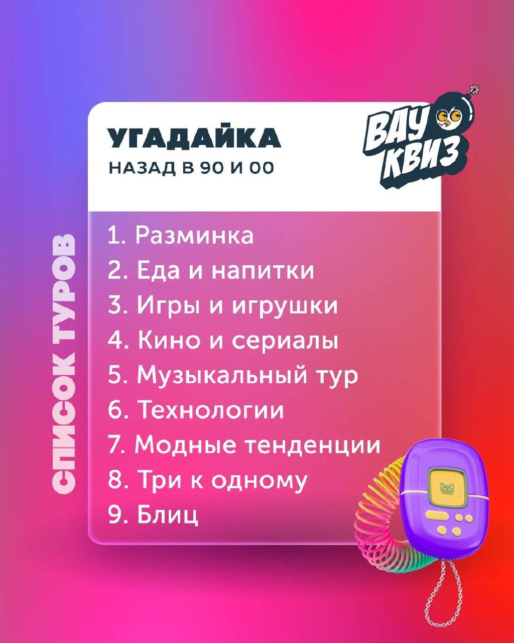 Игра-викторина, посвящённая культуре 1990-х и 2000-х годов: вспомним жвачки, пейджеры, школьные дискотеки, хиты, игры, кино, технологии и модные тенденции той эпохи.