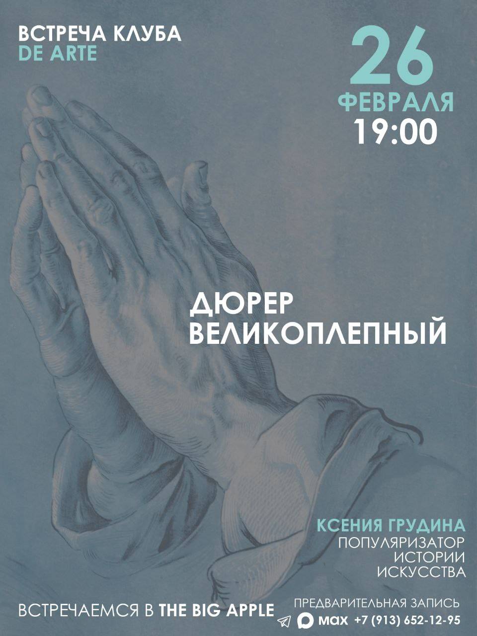 Лекцию об Альбрехте Дюрере подготовила популяризатор истории искусства [id17078453|Ксения Грудина]. Приходите поговорить о Дюрере, его времени и его наследии за чашкой чая. Уютную теплую атмосферу гарантируем!