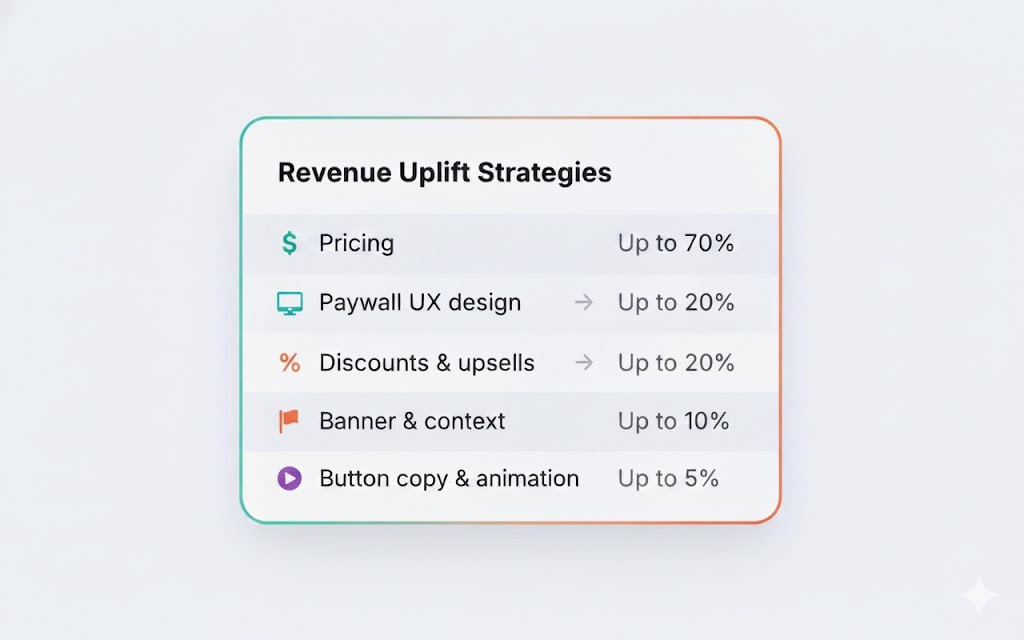 💰 Ценообразование имеет наибольший потенциал для роста дохода — до 70%. Значение имеет не сама цена, а способ её подачи. Приложение для сна, которое продаёт «пожизненный доступ» дороже, чем «подписка на 10 лет», создаёт иллюзию выгоды. Нужны A/B-тесты ценовых матриц. 🎨 Дизайн Paywall UX и скидки/допродажи могут увеличить доход до 20% каждый. Экран должен вести к платежу, а не предлагать «подумать». внедрите механики срочности: -60% действуют 24 часа. ‼️ Баннеры и контекст обеспечивают потенциал роста до 10%. Сравните текст баннера «Продолжить чтение» против «Открыть все возможности». 🚫 Текст кнопки и анимация имеют наименьший потенциал — до 5%. Вишенка на торте, которая снимает последние сомнения. Текст на кнопке: «Начать магию» против «Оплатить», анимация загрузки после клика.
