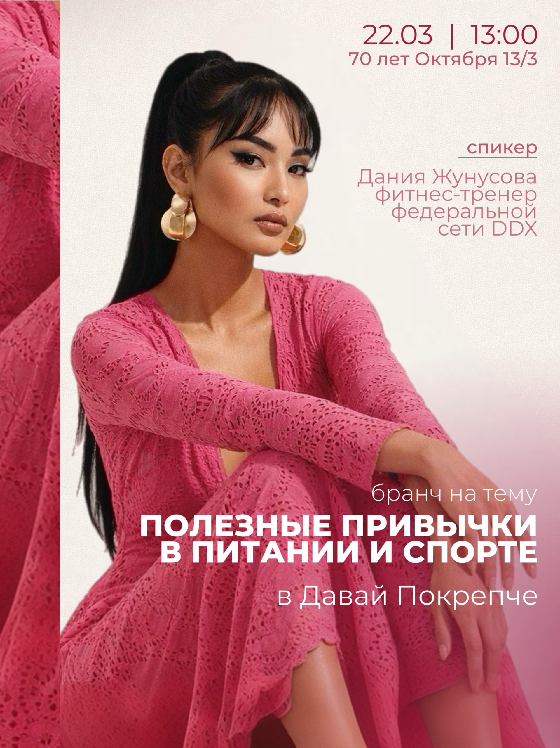На встрече Дания расскажет, как начать правильно питаться, добавить спорт в свою жизнь, без жёстких диет и изнурительных тренировок.