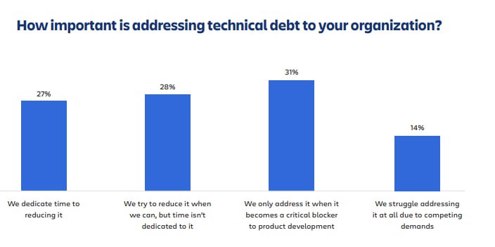 🔵 Удивило, что больше половины компаний системно уделяет время для сокращения тех долга. Я думал, что цифра будет гораздо меньше.