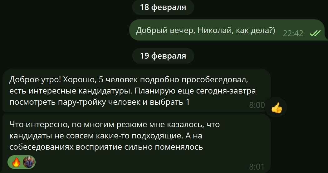 Смотрите, вот живой пример. Николай (на скрине) тоже сначала не верил. Ему казалось, что кандидаты «какие-то не такие», потому что резюме не блестели. А потом начал общаться — и восприятие перевернулось.