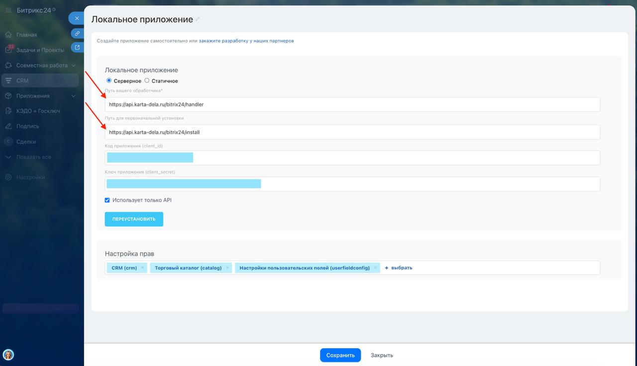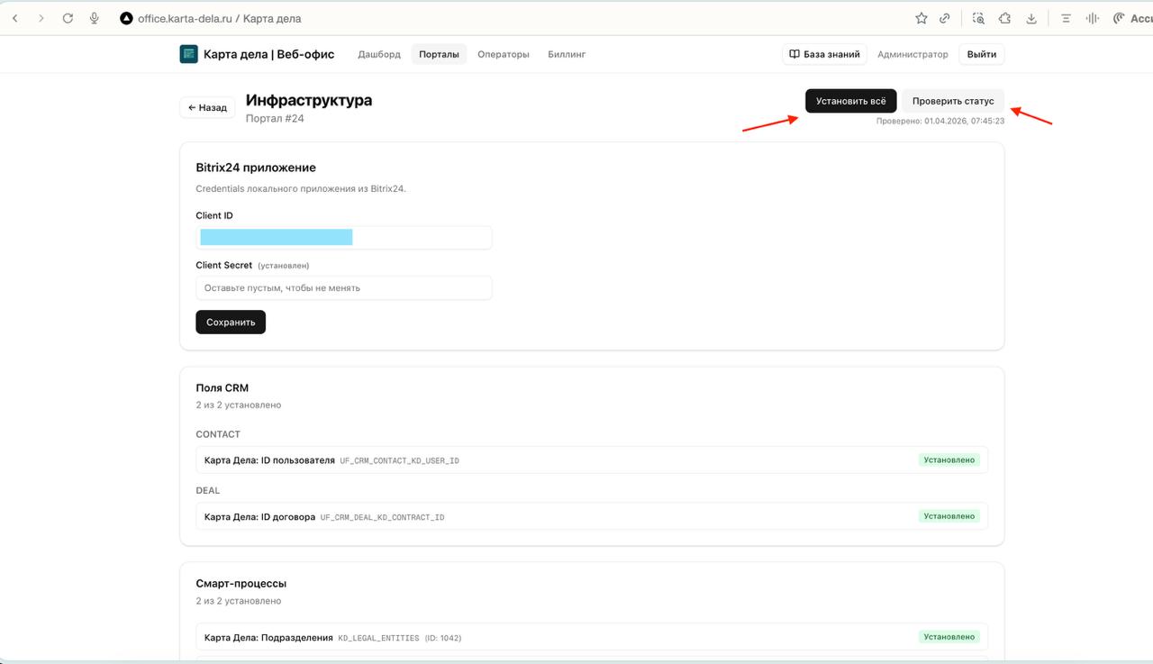 В связи с блокировкой прежнего домена kartadela.ru платформа переведена на новый домен karta-dela.ru. Старые адреса больше не работают, поэтому во всех подключённых Bitrix24-офисах необходимо обновить настройки локального приложения.