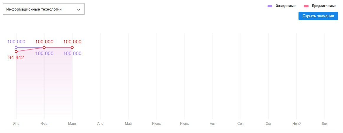 💸 Ожидания vs реальность На графике зарплат линии ожиданий соискателей и предложений бизнеса слились в одну прямую на отметке 100 000 руб.