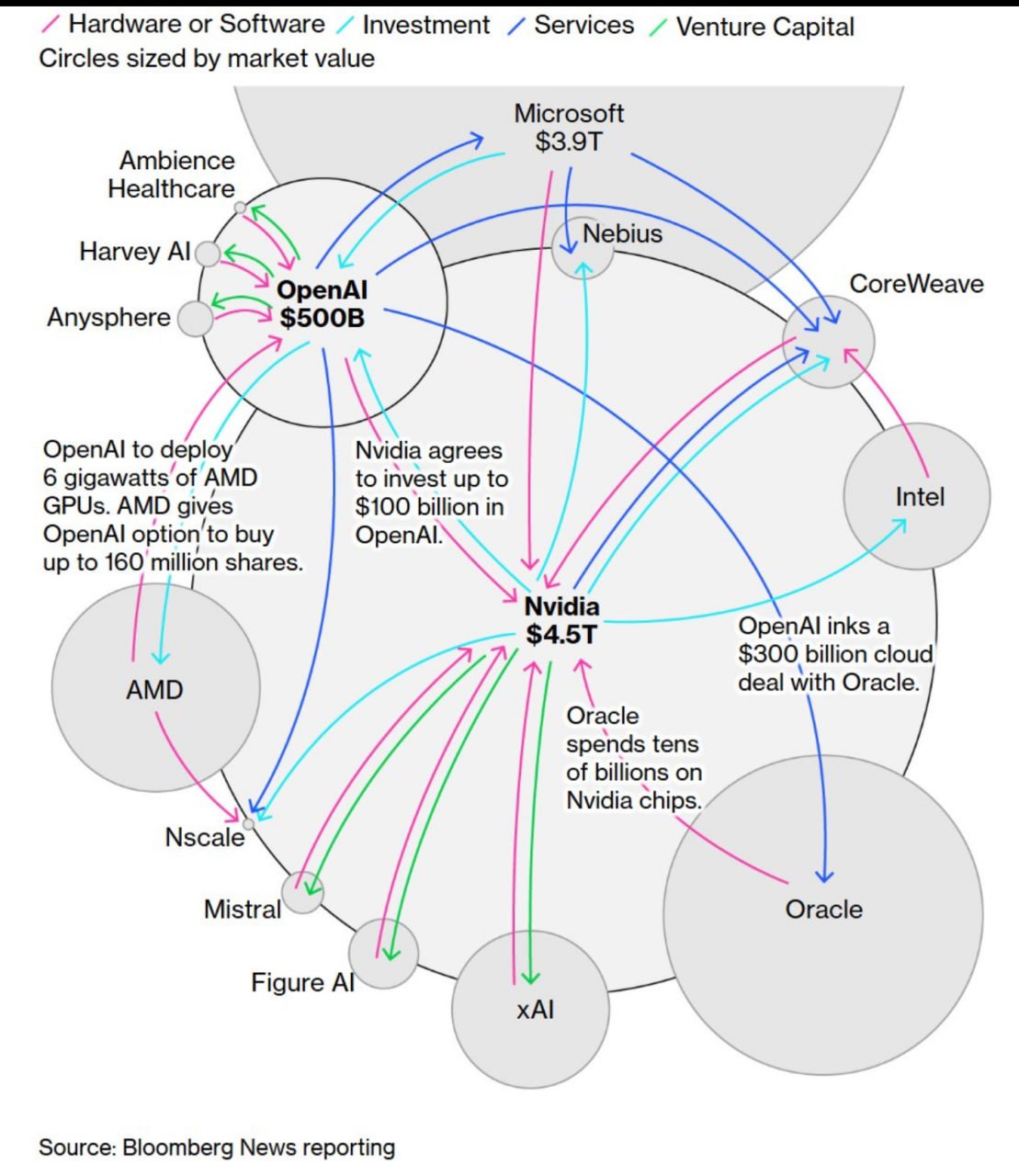 Схема → Nvidia инвестирует $100 млрд в OpenAI → OpenAI закупает чипы у Nvidia. → OpenAI партнёрит с AMD, закупая чипы и становясь их акционером. → Oracle вкладывает $300 млрд в ЦОДы для OpenAI → закупает чипы у Nvidia. → Nvidia инвестирует в xAI Маска → поставки чипов идут в зачёт инвестиций.