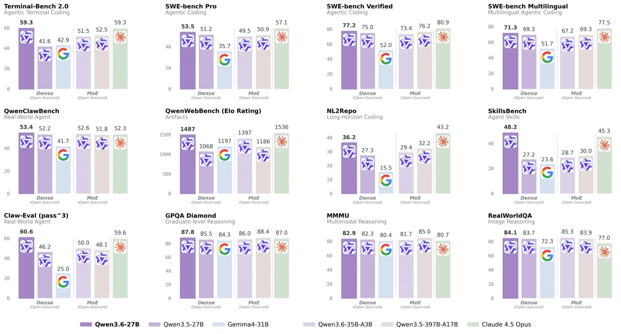 Alibaba выкатили Qwen3.6-27B. И эта моделька уничтожает их предыдущего опенсорс-монстра Qwen3.5-397B-A17B по всем бенчмаркам агентского программирования. Модель, которая суммарно меньше в 15 раз, выбивает 77.2 на SWE-bench Verified (против 76.2 у 397B) и 59.3 на Terminal-Bench 2.0.