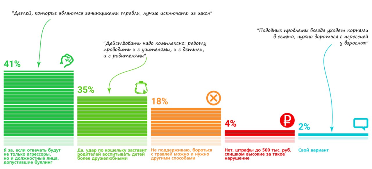 Опрос на портале ГАРАНТ.РУ показал: 76% читателей идею поддерживают. И это неудивительно - многие родители сталкивались с ситуацией, когда ребёнка травят, а повлиять на обидчиков практически невозможно.